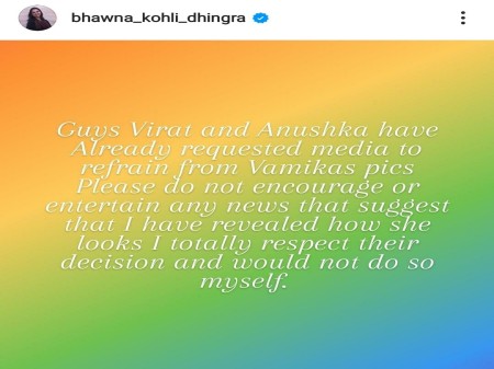 Virat's sister and Anushka's sister-in-law Bhawna Kohli Dhingra recently during an Ask Me Anything session on Instagram, spoke about Kohli's daughter in a few words. Bhawna was asked, "Have you met Vamika whom she looks like more Anushka or Virat?" To which Bhavna replied, "Yes we have and she is an angel. Now, Bhawana shared clarification about the same and repeated that she doesn't want to intrude in Virat and Anushka's privacy and totally understands the reason for the same. In the clarification, she wrote, "Guys Virat and Anushka have already requested media to refrain from Vamikas pics. Please do not encourage or entertain any news that suggest that I have revealed how she looks I totally respect their decision and would not do so myself."
