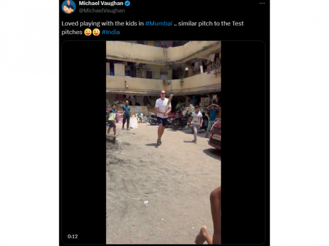 In the caption, Vaughan playfully compared the uneven surface of the makeshift pitch to the test pitches, writing, "Loved playing with the kids in #Mumbai. Similar pitch to the Test pitches #India."