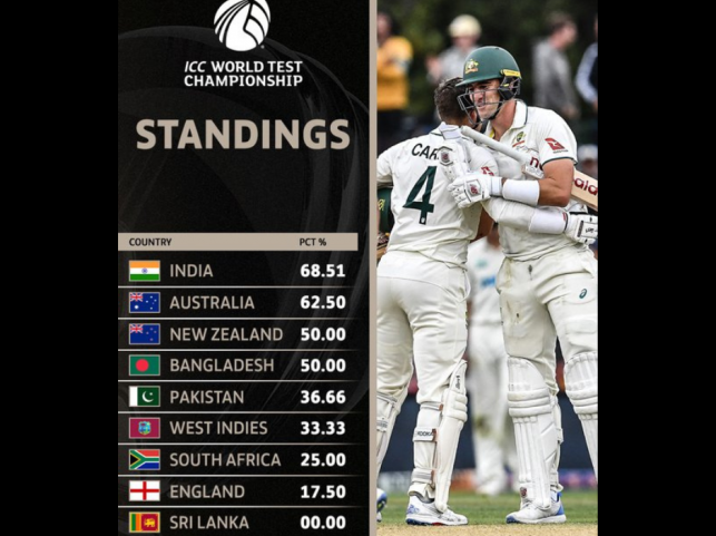 Australia's winning percentage stood at 59% before their second Test win against New Zealand. This victory propelled them to 62.50%, pushing New Zealand (50%) to third and inching closer to India. Bangladesh (50%) and Pakistan (36.66%) round out the current standings.