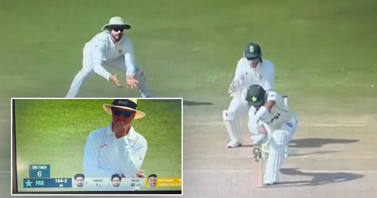 On the 59th over of the match against South Africa, Babar got out on a Harmer ball. Babar played down the wrong line and was struck on the pad. South Africa reviewed the not-out decision, and the replays confirmed there was no bat involved. Ball-tracking showed the ball hitting the leg stump, and the decision was overturned.