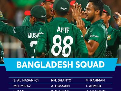 Bangladesh - Shakib Al Hasan, Sabbir Rahman, Mehidi Hasan Miraj, Afif Hossain, Mossadeq Hossain, Liton Das, Yasir Ali, Nurul Hasan, Mustafizur Rahman, Saifuddin, Taskin, Ahmed, Edabot Hossain, Hasan Mahmood, Najmul Hossain, Nasum Ahmed; Reserves - Shoriful Islam, Shaka Mehedi Hasan, Rishad