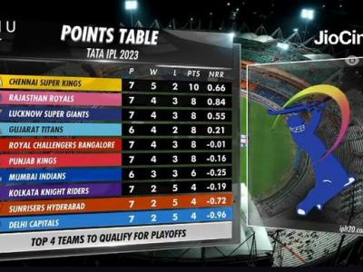 If you look at the IPL 2023 Point Table, the Chennai Super Kings team is at the top position with 10 points. Mahendra Singh Dhoni's team has won 5 out of 7 matches. Then Rajasthan Royals (4 wins and 3 losses), Lucknow Super Giants (4 wins and 3 losses), Gujarat Titans ( (4 wins