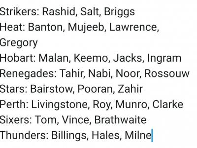 Strikers - Rashid Khan, Phil Salt, Danny Briggs; Brisbane heat - Tom Banton, Mujib Ur Rehman, Dan Lawrence, Louise Gregory; Hobart Hurricanes - David Malan, Keemo Paul, Colin Ingram, Jan Doren; Melbourne Stars - Johnny Bairstow, Nicholas Pooran, Zahir Khan - Melbourne Stars.