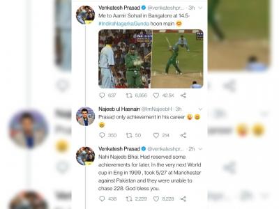 "Prasad only achievement in his career," wrote Najeeb ul Hasnain - a Twitter user, who describes himself as a sports presenter. "Nahi Najeeb Bhai. Had reserved some achievements for later. In the very next World cup in Eng in 1999 , took 5/27 at Manchester against Pakistan and they were unable to chase 228. God bless you," Prasad wrote back.