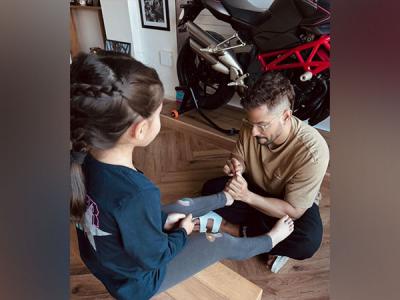 The photograph shows Kunal grooming Inaaya's little feet.