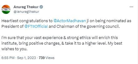 Union Minister Anurag Thakur congratulated the actor. On X, earlier known as Twitter, Anurag wrote, “Heartiest congratulations to @ActorMadhavan ji on being nominated as President of @FTIIOfficial and Chairman of the governing council. I'm sure that your vast experience & strong ethics will enrich this institute, bring positive changes, & take it to a higher level. My best wishes to you.”