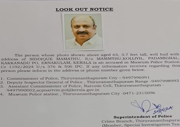The Kerala Police has issued a lookout notice against Malayalam actor Siddique who is reportedly on the run after ...