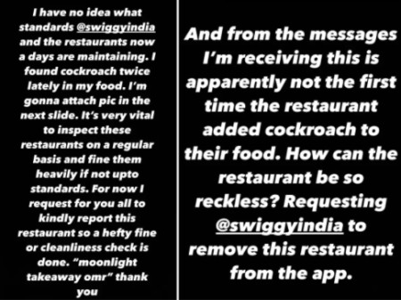 Actor Nivetha Pethuraj took to her Instagram account to share a harrowing experience of finding a cockroach in her food. Sharing the post, she wrote, "I have no idea what standards @swiggyindia and the restaurants nowadays are maintaining. I found cockroaches twice lately in my food. It’s very vital to inspect these restaurants on a regular basis and fine them heavily, if not up to standards. Moonlight takeaway omr,”Nivetha Pethuraj said others were also sending her messages, complaining about the same restaurant. "And from the messages, I'm receiving this apparently not the first time the restaurant added cockroach to their food. How can the restaurant be so reckless? Requesting @swiggindia to remove this restaurant from the app", wrote Nivetha.