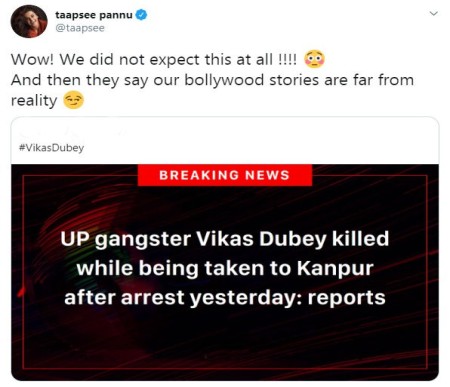 Actress Taapsee Pannu took to social media and reacted to the news of the encounter of gangster Vikas Dubey who was arrested yesterday in Ujjain, Madhya Pradesh. The Thappad actress compared it to a Bollywood script. She tweeted, "Wow! We did not expect this at all !!!! And then they say our bollywood stories are far from reality". After his arrest yesterday Vikas Dubey was being brought back to Kanpur via road and it is alleged that the car he was in skidded and overturned due to heavy rains. After which the gangster tried to flee by snatching a rifle from one of the injured policemen. He then allegedly opened fire at the police and was shot dead in retaliation by the cops.
