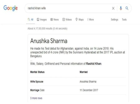In a bizzare development, Google is showing Anushka Sharma as Afghanistan cricketer Rashid Khan's wife. In reality, Anushka Sharma ...