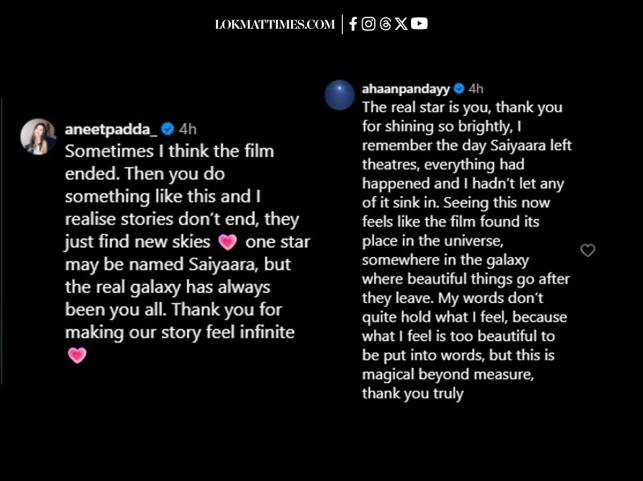 Saiyaara fan club shared this special moment on Instagram and wrote, "Some love stories deserve to be remembered forever, not just on screen but in the universe itself. That’s why, as a gift for our fandom, I’ve named a star Saiyaara - so Ahneet shines endlessly in the sky forever and ever and ever." This photo went viral and the cast has reacted to this. In comment section Ahaan Panda wrote, "The real star is you, thank you for shining so brightly, I remember the day Saiyaara left theatres, everything had happened and I hadn’t let any of it sink in. Seeing this now feels like the film found its place in the universe, somewhere in the galaxy where beautiful things go after they leave. My words don’t quite hold what I feel, because what I feel is too beautiful to be put into words, but this is magical beyond measure, thank you truly ." Aneet also commented on the post and wrote, "Sometimes I think the film ended. Then you do something like this and I realise stories don’t end, they just find new skies one star may be named Saiyaara, but the real galaxy has always been you all. Thank you for making our story feel infinite."