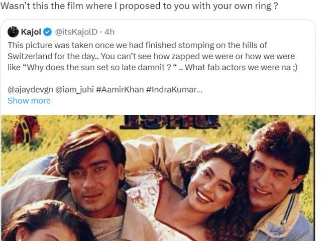 Taking to Instagram, Kajol, who has a fan base of 15.5 million followers, took a stroll down the memory lane, and shared a still from the movie, tagging her co-stars.Along with it, the actress wrote, "This picture was taken once we had finished stomping on the hills of Switzerland for the day... You can't see how zapped we were or how we were like 'Why does the sun set so late damnit?'..What fab actors we were na @ajaydevgn @iamjuhichawla #aamirkhan #indrakumar #hillsofswitzerland #ishq #workhardplaybetter #26yearsofishq."