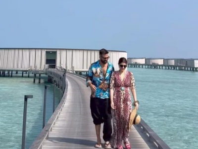 In the video, Akshay and Twinkle are seen walking hand-in-hand along a wooden pathway surrounded by clear blue waters at the property where they were put up.