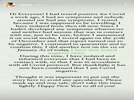 Alaya F took to her Instagram story to inform her fans that she had tested positive for COVID-19, a week ago. The actress has now recovered from the virus and revealed that she had no symptoms.The actress wrote, ''Hi Everyone! I had tested positive for Covid a week ago, I had no symptoms and nobody around me had any symptoms. I tested because I was supposed to be travelling. I have isolated myself from then till now. Since I hadn't developed any symptoms whatsoever and neither had anyone that was in contact with me, just to be sure, before I announced it on social media, I tested again on the 30th of December and that report turned out to be negative, I continued to quarantine and to confirm this, I did another test on the 1st of January. As of today, I have now tested negative twice.