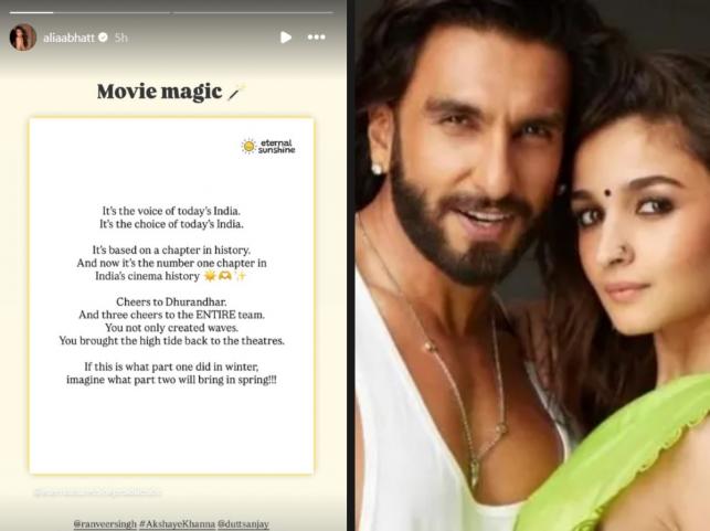 Sharing their post Alia Bhatt took Instagram story and wrote movie magic. Dhurandhar production post reads, "It's the voice of today's India. It's the choice of today's India. It's based on a chapter in history. And now it's the number one chapter in India's cinema history."