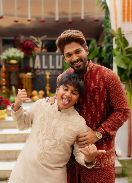 In the picture, Allu Arjun is seen dressed in a maroon traditional kurta, smiling as he holds Ayaan close.