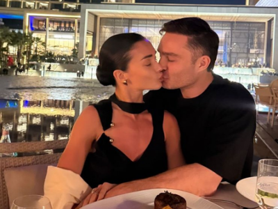 The image featured the couple sharing a romantic kiss. Amy, dressed in a sleek black outfit with her hair neatly pulled back, leans in as Westwick, wearing a black T-shirt, holds her close across the table. A plated gourmet meal and wine glasses can be seen kept on the table.