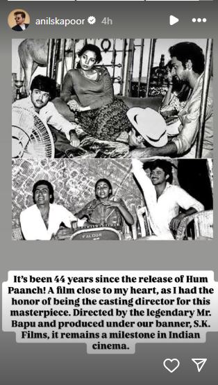 On Thursday, Anil posted a picture on Instagram Story and wrote, "It's been 44 years since the release of Hum Paanch! A film close to my heart, as I had the honor of being the casting director for this masterpiece. Directed by the legendary Mr.Bapu and produced under our banner, S.K. Films, it remains a milestone in Indian cinema."
