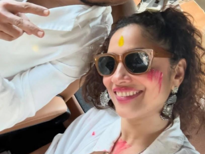 In one picture, Ankita is seen sitting inside a car wearing sunglasses and with gulal smeared on her cheeks and forehead. She was seen smiling as she showed her colour-filled palm to fans while clicking a selfie.
