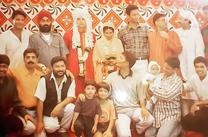 Among the many faces surrounding the bride and groom, a young Irrfan Khan can be spotted.