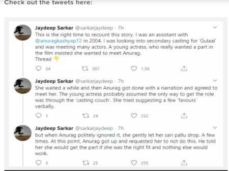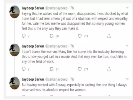 Continuing the thread with a series of tweets, Jaydeep wrote, "She waited a while and then Anurag got done with a narration and agreed to meet her. The young actress probably assumed the only way to get the role was through the ‘casting couch’. She tried suggesting a few ‘favours’ verbally." Followed by "but when Anurag politely ignored it, she gently let her sari pallu drop. A few times. At this point, Anurag got up and requested her to not do this. He told her she would get the part if she was the right fit and nothing else would work."