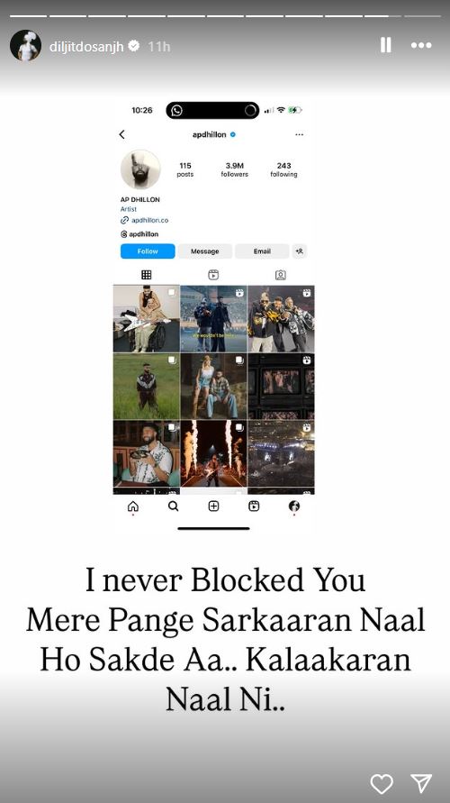In a move to clear the air, Dosanjh took to Instagram shortly after the concert. Sharing a screenshot of AP Dhillon's account, Dosanjh wrote, "I never blocked you. Mere pange sarkaaran naal ho sakde aa, kalaakaran naal nahi." (Translation: "I never blocked you. My issues could be with governments, not with artists.")