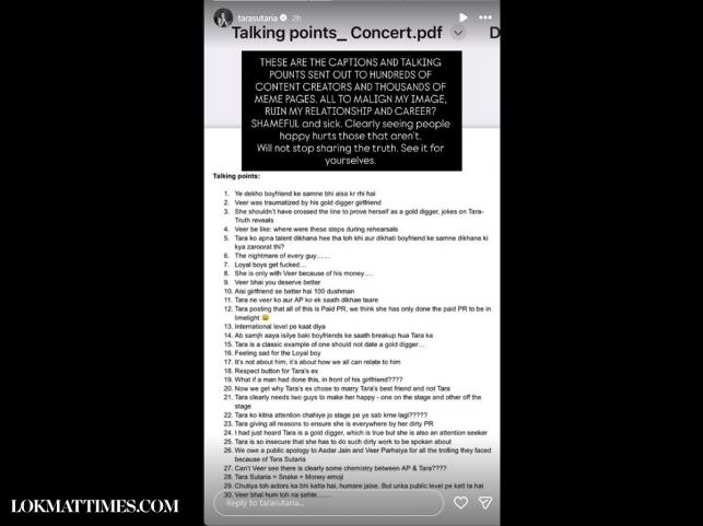 Actress and singer Tara Sutaria has finally addressed the AP Dhillon kissing controversy, claiming that it was deliberately framed to defame her and harm her relationship and career. Tara, who is currently dating actor Veer Pahariya, shared a screenshot of a PDF which had several negative captions. The document was titled “Talking Points.”