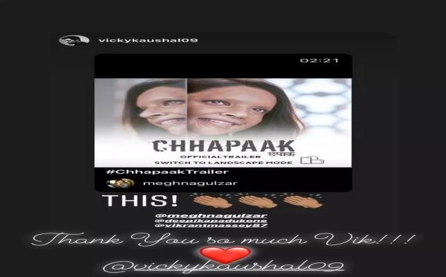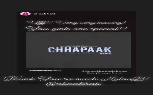 Many celebrities also took to their social media to share their reaction. Among the notable ones who praised Deepika's role were Alia Bhatt and Vicky Kaushal. The Raazi stars, wrote, "Uff!! very very moving! You girls are special!! while Vicky Kaushal shared the applauding emojis. Later, DP reposted both the stories and thanked Aloo B and Vik for their wishes. The film also marks Deepika's debut as a producer. Meanwhile, Aamir, who is currently busy shooting for Laal Singh Chaddha in Chandigarh, took to Twitter to react to the trailer. Apart from appreciating it, he called Meghna Gulzar's directorial venture Chhapaak, "an important movie" and also congratulated the entire team of the film.