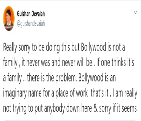 The tragic death of Sushant Singh Rajput has once again questioned the nepotism culture in Bollywood. The Kedarnath actor passed away on June 14 at his Bandra residence he hanged himself at his Bandra residence. The unexpected demise shocked everyone and the case is being investigated by the Mumbai police. Post his death a number of celebs revealed some of the ugly truth of B-town. Actor Gulshan Devaiah on Twitter wrote, that Bollywood is not a family , it never was and never will be . If one thinks it’s a family .. there is the problem. Bollywood is an imaginary name for a place of work that’s it .