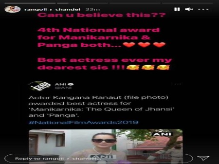 Now, reacting on Kangana's win, her sister Rangoli Chandel took to her social media handles to express her happiness over the same. Taking to her Instagram handle, Rangoli shared a news article of a news wire and wrote, Can you believe this?? 4th National Award for Manikarnika and Panga both… Best actress ever my dearest sis!!!” She also posted a photo from the announcement ceremony of the awards and said, “Best birthday gift ever to my sister,” followed by heart emoticons. The 67th National Film Awards took place in New Delhi and are for films from the year 2019. The event was organized by the Directorate of Film Festivals, which comes under the Ministry of Information and Broadcasting.