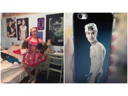 The carousel of images included a childhood photograph of Billie dressed in a rainbow sequin dance costume paired with white Converse shoes, standing in a bedroom covered with Justin Bieber posters. Another slide featured a whiteboard where she had rewritten lyrics from Aqua's 'Barbie Girl', adding fun references to Bieber's birthday, his Canadian roots, and her teenage obsession.