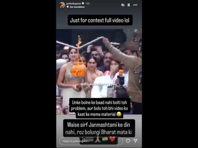 On Monday (17 August), Janhvi took instagram and re-posted the viral video in her story. In video MLA Ram Kadam had chanted "Bharat Mata Ki Jai" first, and she was merely responding to it. In caption she wrote, "Unke bolne ke baad nahi bolti toh problem, aur bolo toh bhi video ko kaat ke meme material. Waise sirf Janmashtami nahi, roz bolungi Bharat Mata ki jai." (He chanted first and if she wouldn't have responded to it then also you would have trolled. I would say Bharat mata Ki Jai everyday )