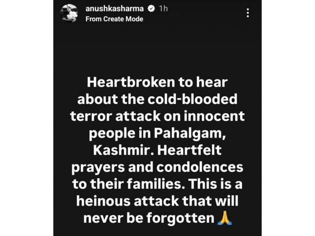 Anushka Sharma wrote that she is heartbroken to hear about the cold-blooded terror attack on innocent people in Pahalgam Kashmir. Heartfelt praters and condolences to their families. This is a heinous attack that will never be forgotten.