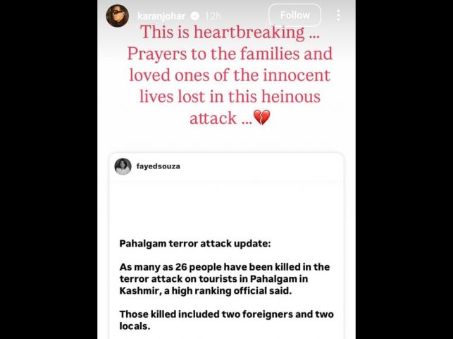 Karan Johar reposted Faye Dsouza's post on his Instagram story and wrote, "This is heartbreaking prayers to the families and loved ones of the innocent lives lost in this heinous attack".