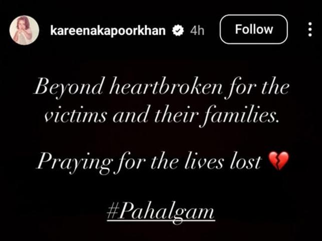 In Instagram story Kareena Kapoor Khan wrote, "Beyond heartbroken for the victims and their families. Praying for the lives".