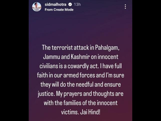 Siddharth Malhotra who is known for his role in 'Shershaah' took Instagram and wrote, The terrorist attack in Pahalgam, Jammu and Kashmir on innocent civilians is a cowardly act. I have full faith in our armed forces and, I'm sure. they will do the needful and ensure justice. My prayers and thoughts are with the families of the innocent victims. Jai Hind".