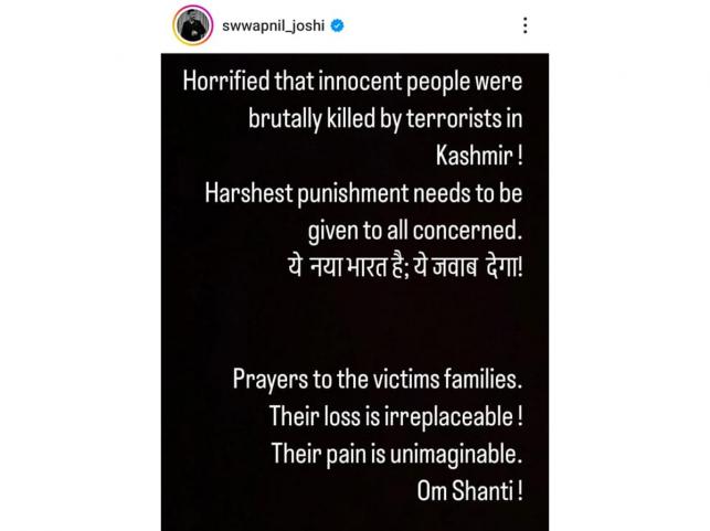 Popular Marathi and Hindi Actor Swapnil Joshi said, "Horrified that innocent people were brutally killed by terrorists in Kashmir! Harshest punishment needs to be given to all concerned. ये नया भारत है; ये जवाब देगा! Prayers to the victims' families. Their loss is irreplaceable! Their pain is unimaginable."