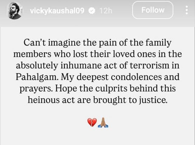 Chhavaa fame Vicky Kaushal took his instagram story and gave condolence to the deceased family said, "Can't imagine the pain of the family members who lost their loved ones in the absolutely inhumane act of terrorism in Pahalgam. My deepest condolences and prayers. Hope the culprits behind this heinous act are brought to justice."