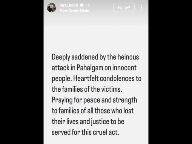 Virat Kohli said he is Deeply saddened by the heinous attack in Pahalgam on innocent people. Heartfelt condolences to the families of the victims. Praying for peace and strength to families of all those who lost their lives and justice to be served for this cruel act.