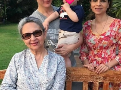 Wishing her 'Tim Tim' on his birthday, Saba shared some throwback photos with the birthday boy. The primary photo had her posing with sister-in-law, Kareena Kapoor, Taimur, and mom Sharmila Tagore.