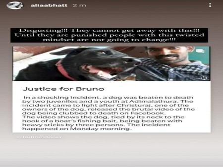 On Monday, a 9-year-old labrador by the name of Bruno was brutally beaten to death by three youths in Kerala’s Adimalathura. Notably, Bruno, a black Labrador, was jointly taken care of by eight siblings. The incident came to light after one of the owners of the dog, Christuraj shared the horrifying video on his Facebook page. The incident became a talking point on Twitter, with several celebs demanding strict punushment for the culprits. Anushka Sharma, Alia Bhatt, Tiger Shroff, and Disha Patani, took to social media to call out the incident. Disha Patani wrote, "Stop animal cruelty. Every animal on this planet deserves to be loved and treated well." As for Alia, the actress was shocked with extremity of the incident and wrote, "Disgusting!! They cannot get away with this!! Until they are punished people with this twisted mindset are not going to change!! (sic)."