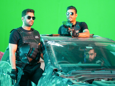 The behind-the-scenes footage from the shoot showed Dhoni and Madhavan standing on top of a car wearing task force attire with a lot of others accompanying them. The two can be seen holding guns as they pose in front of the green screen. Both Dhoni and Madhavan look stylish wearing black sunglasses.