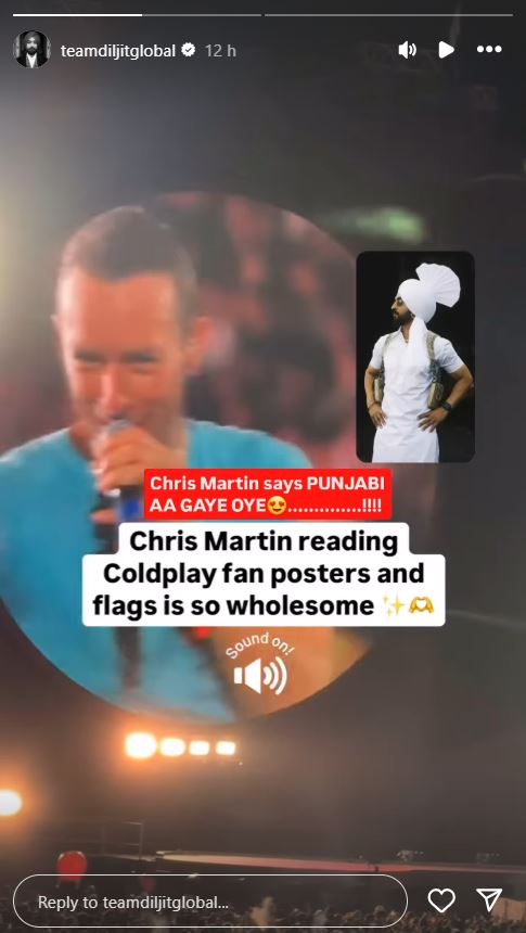 Diljit's team shared the moment on Instagram Stories accompanied by the caption, "Chris Martin says PUNJABI AA GAYE OYE.....!!!! Chris Martin reading Coldplay fan posters and flags is so wholesome."