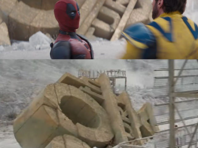 · 20th Century Logo Ruins: A major fight between Deadpool and Wolverine takes place with the remnants of the 20th Century Fox logo in the background. This is a meta-reference to Disney's acquisition of 20th Century Fox in 2019, signifying the end of the X-Men franchise under Fox and the characters' return to Marvel Studios.