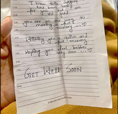 Actress took a photo of that note and posted on her official Instagram story and wrote, "Love and More love this keeps me going. From Housekeeping department from Kokilaben hospital." In note they wrote, "Dear Hina Khan I know this surgery has been hard for you, but I am so glad you are on the way to making a full recovery hoping you feel better very soon Get well soon."