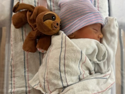 The couple's announcement featured a sweet picture of the newborn, who they welcomed into the world last week, snuggled up in a blanket wearing a hospital beanie and curled up to a stuffed animal sloth.