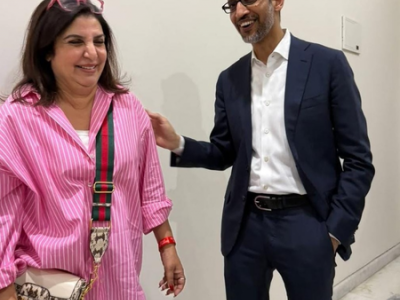 The pictures show Farah and Pichai sharing a candid, light-hearted exchange at an office space. Farah is seen dressed in a pink striped shirt paired with blue denims and Pichai, on the other hand, looks classy in a navy suit layered over a crisp white shirt. In one picture, he is seen warmly placing a hand on Farah’s shoulder as they laugh mid-conversation.