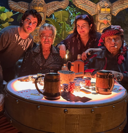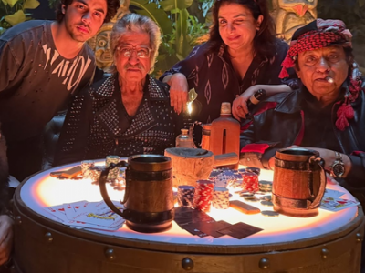 Farah took to Instagram, where she shared three pictures from the sets of the track. The pictures featured Farah posing with Shakti Kapoor, Ranjit and Gulshan Grover. One image also had Aryan Khan posing alongside them.