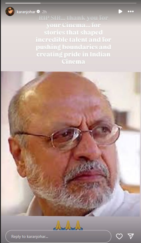 Director Karan Johar wrote on his Instagram stories, "RIP Sir, Thank you for your Cinema... for stories that shaped incredible talent and for pushing boundaries and creating pride in Indian Cinema."