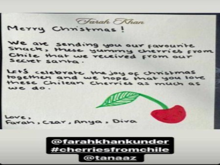 Gauri Khan, on Tuesday shared a glimpse of her Christmas gift that she received from filmmaker Farah Khan. Taking to Instagram Stories, Gauri shared a note from Farah that she got with the gift. Gauri Khan shared Farah's note that read, "Merry Christmas! We are sending you our favourite snack, these yummy cherries from Chile that we received from our secret Santa. Let's celebrate the joy of Christmas together and we hope that you love these Chilean cherries as much as we do. Love, Farah, Czar, Anya, Diva." Czar, Anya, and Diva Kunder are Farah and her husband Shirish Kunder's kids.